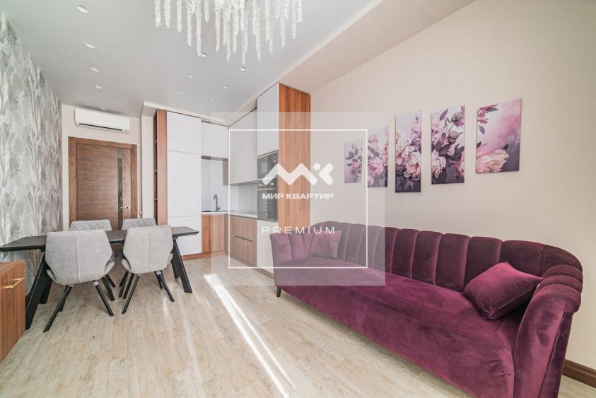 Квартира расположилась на 8-м этаже, общей площадью 76 м2, две изолированные спальни, одна из которых с лоджией, кухня оборудованная всей необходимой техникой, два полноценных сан.узла, гардеробная комната. Двусторонняя планировка.