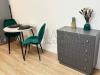 В зоне гостиной есть раскладной диван, комод, раскладной кухонный стол и стулья.