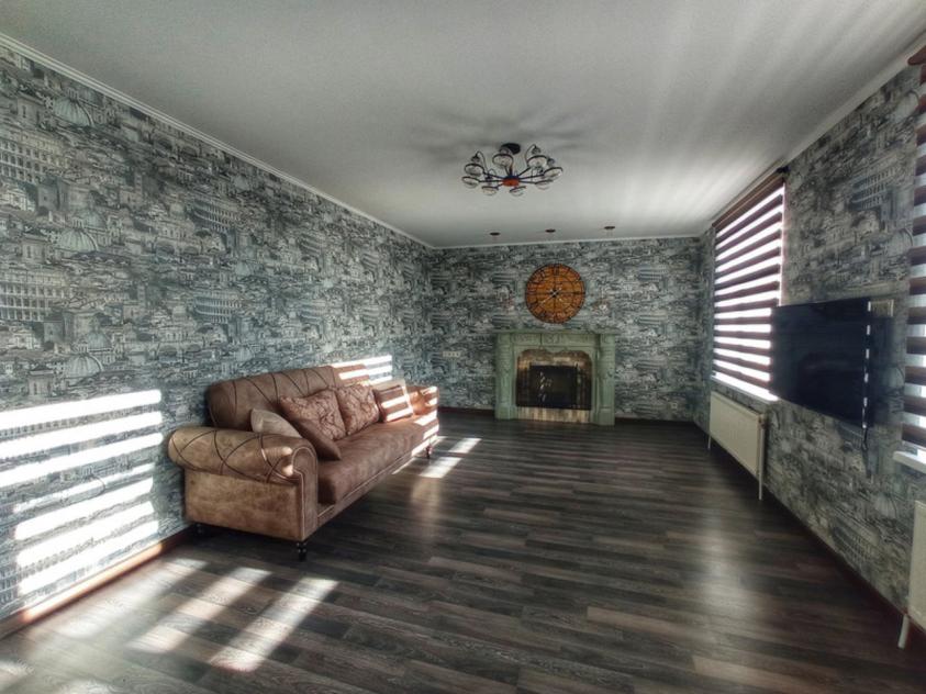 Просторная гостиная с двумя окнами, с электрическим камином и кондиционером. На территорию кухни из гостиной ведёт арка. В кухне есть посудомоечная машина, вытяжка, местная подсветка. Всё продумано до мелочей.
