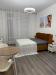 В зоне отдыха расположена удобная, новая двуспальная кровать с ортопедическим матрасом (новым), есть комплект белья, подушки и покрывало, напротив которой стоит комод с телевизором.