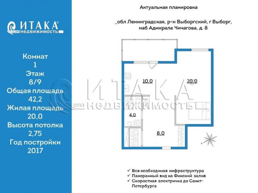 Кухня – 10 м2, комната – 20м2; прихожая – 8 м2. Совмещенный санузел – 4кв.м. Высота потолка – 2,75м.