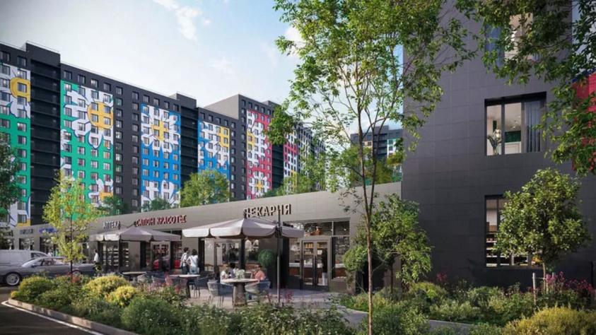 Корпуса соединяются коммерческими помещениями, с магазинами, кафе, озон, вайлдберриз.