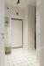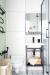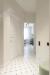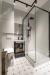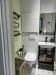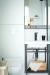 В сан.узле установлена душевая кабина, оснащённая душевой системой; подвесной унитаз, гигиенический душ, раковина, зеркало. Контрастные аксессуары на фоне светло-серой плитки и фисташковой стены придают помещению очень стильный облик.