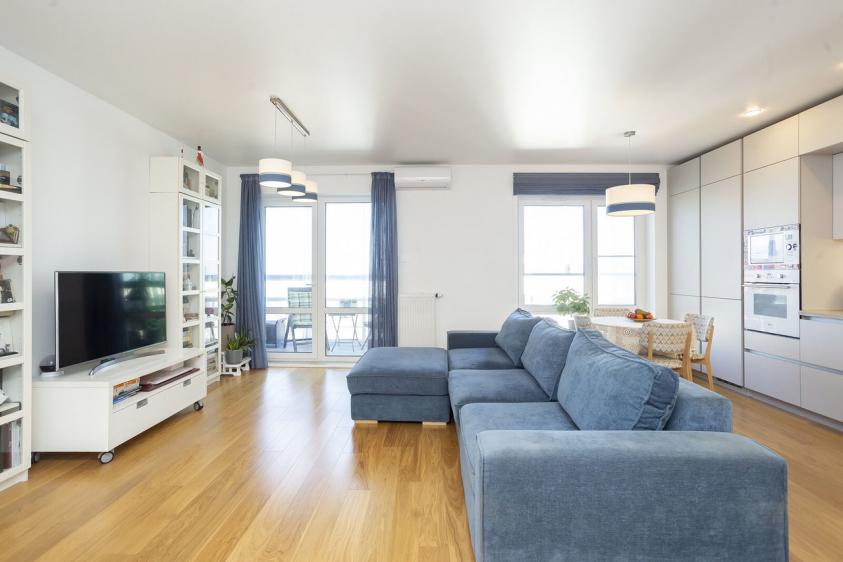 Комфортная, теплая и светлая (окна в пол!) квартира с ремонтом и встроенной мебелью 73 кв.м.+ лоджия 12 кв.м. Удобная планировка: две приватные спальни и большая кухня-гостиная 37 кв.м. как место для общения.