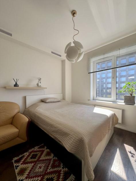В квартире выполнен качественный дизайнерский ремонт, установлена функциональная встроенная кухня, встроенные шкафы и кондиционер. Санузел раздельный. Окна выходят во двор — тихо и спокойно.