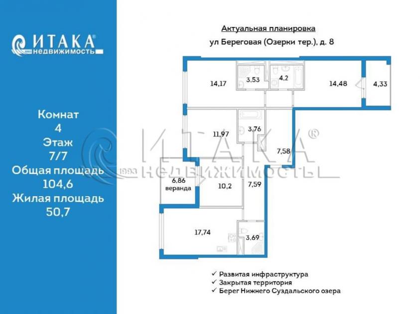 - квартира двухсторонняя, 3 санузла, вид из окон на озеро и во двор