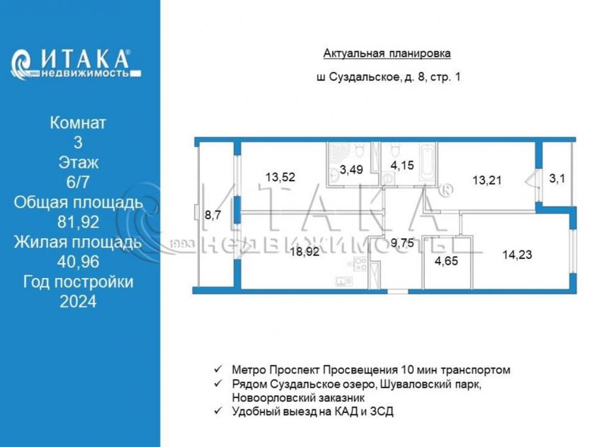 • Жилые комнаты: 14,23 кв.м., 13,52 кв.м. и 13,21 кв.м. — изолированы