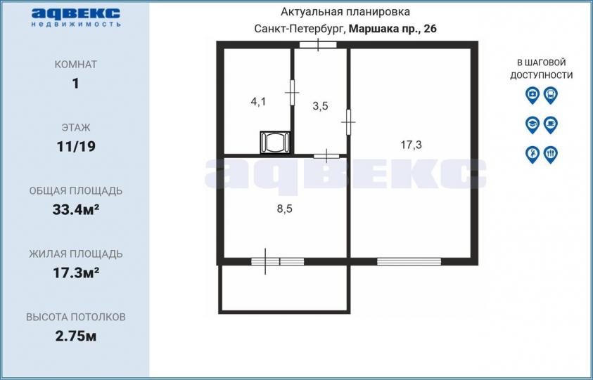 Квартира расположена на 11 этаже 19-этажного дома. Общая площадь квартиры — 33,4 м?, из которых 17,3 м? занимает жилая площадь, а 8,5 м? — кухня. Есть один совмещённый санузел. Выполнен косметический ремонт. Окна выходят на ручей. Остаётся всё, что на фото. Развитая инфраструктура. Близость к общественному транспорту .