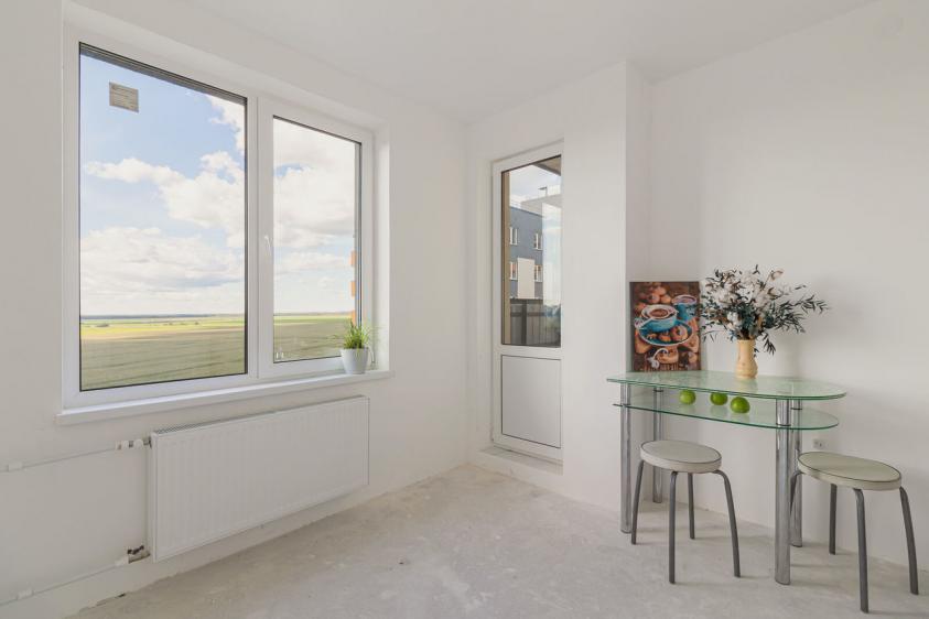 Большая жилая комната 16,1 м? с двумя панорамными окнами наполнена светом и открывает вид на просторное, незастроенное пространство.