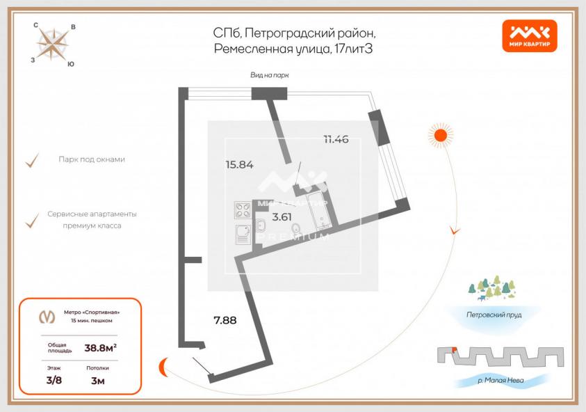 17/33 - сервисный апарт-отель премиум-класса в Санкт-Петербурге. Закрытая территория, вдоль Малой Невы устроят променад, для резидентов будет работать собственный кинозал, терраса площадью 120 кв.м, фистнес и спа залы. Также будет доступен коворкинг, детский клуб, лаунд зона с библиотекой. Жемчужиной дизайн-концепции от Woodstone станет «Небесная гостиная» - фантастическое пространство с панорамным рестораном на крыше комплекса.