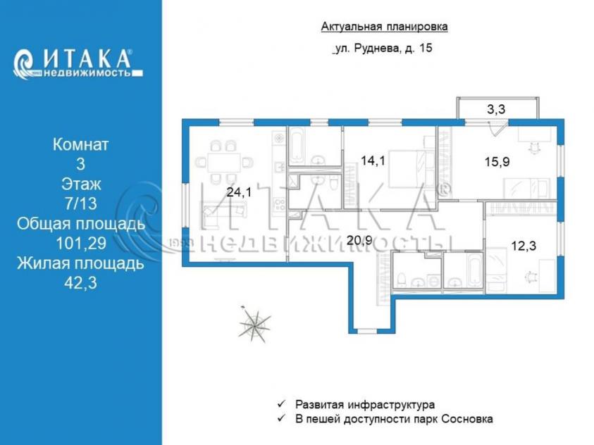1-90954 Роскошная элитная трёхкомнатная квартира в ЖК «Руднева 15» — премиальное пространство для жизни вашей семьи!