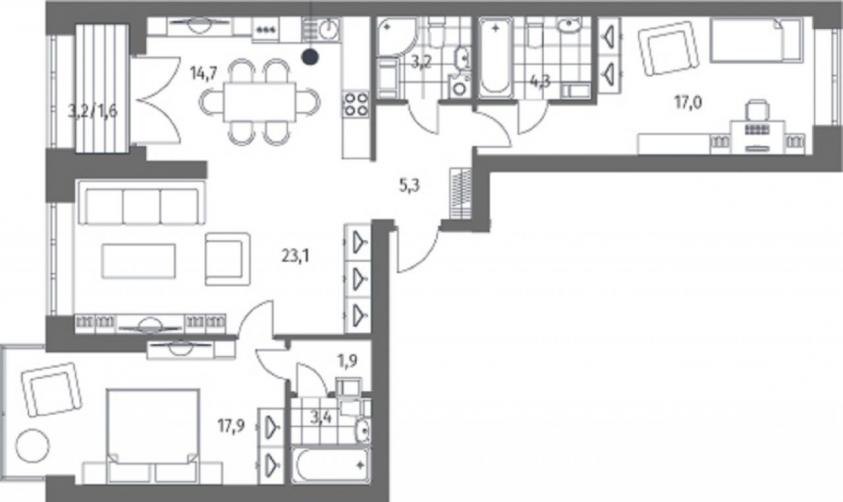 Уникальная планировка 3х комнатной квартиры с 3мя санузлами (с 2 ванными и 1 душем).