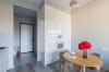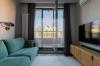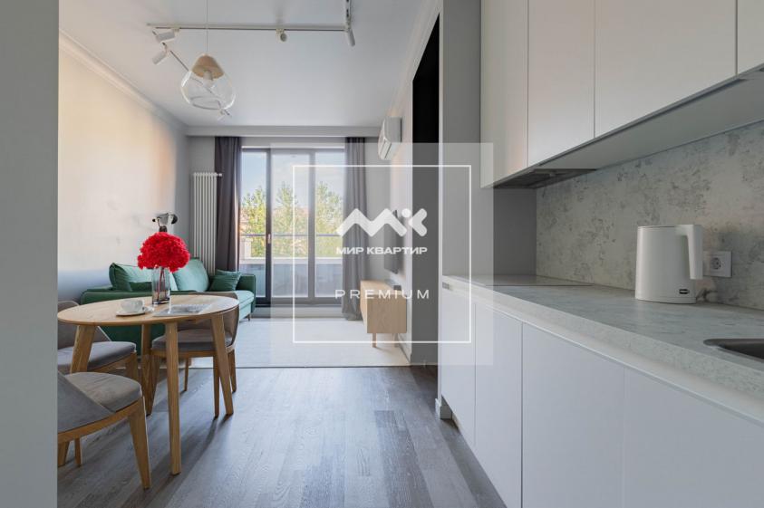 Квартира наполнена светом благодаря большому панорамному окну в кухне-гостиной, которое открывает доступ к французскому балкону, отделанному террасной доской.