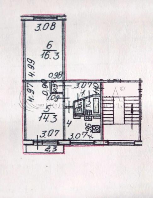 Площадь квартиры 44,9 кв.м, комнаты 16,3 + 14,3 кв.м, кухня 7 кв.м, санузел раздельный, балкон. Плита газовая, горячее водоснабжение центральное. Ремонт требуется.