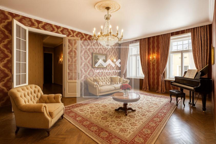 Квартира расположена на 6 этаже, окнами во двор, при этом очень светлая благодаря высокой инсоляции. Просторная гостиная 32,2 кв.м. и три отдельные спальни 32,2 + 14,3 + 13,7 кв.м. Кухня 23,3 кв.м. с выходом на черную лестницу. Большой раздельный сан.узел с окном. Кладовые, в одной есть возможность реализовать постирочную.