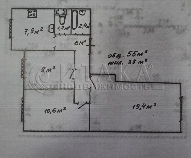 Квартира двусторонняя, все комнаты ( 19,4кв.м.; 10,6 кв.м.; 8 кв.м.) изолированы, кухня 7,9 кв.м., санузел раздельный, коридор 6 кв.м..