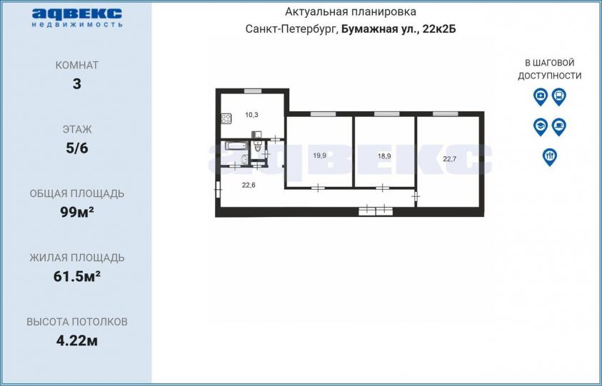 Продаётся просторная трёхкомнатная квартира с высокими потолками 4,22 м, в кирпичном доме в стиле сталинский ампир, с лифтом в парадной, в шаге от парка Екатерингоф, в 10 минутах пешком от метро Нарвская, общей площадью 99 м2.