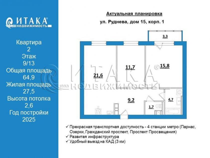 129072090 Продаётся 2-комнатная квартира просторной планировки по адресу: СПб, ул. Руднева, д.15 кор 1, Дом монолитный. Этаж -12. Окна на улицу. Общая площадь 64.9 кв. м. Жилая площадь 27,5 кв. м (15,8+11,7), комнаты изолированные. Площадь кухни-столовой 21,8 кв. м, что позволяет организовать техническую зону кухни и зону отдыха. Санузел раздельный. Застекленный балкон. Дом расположен в благоустроенном микрорайоне с готовой инфраструктурой. Прекрасная транспортная доступность - 4 станции метро (Парнас, Озерки, Гражданский проспект, Проспект Просвещения), остановки общественного транспорта, удобный выезд на КАД (3 км). Район обжитой, тихий, спокойный, удобный. Рядом расположен муниципальный детский сад. Закрытый двор. Лифты марки OTIS. Полная чистовая отделка хорошего качества. Возможна ипотека, семейная ипотека, использование материнского капитала.