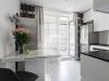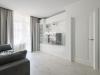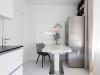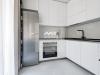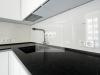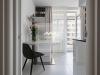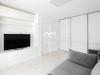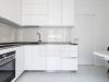 На кухне расположен гарнитур с белыми глянцевыми фасадами, столешницей из камня и встроенной техникой премиум-класса.