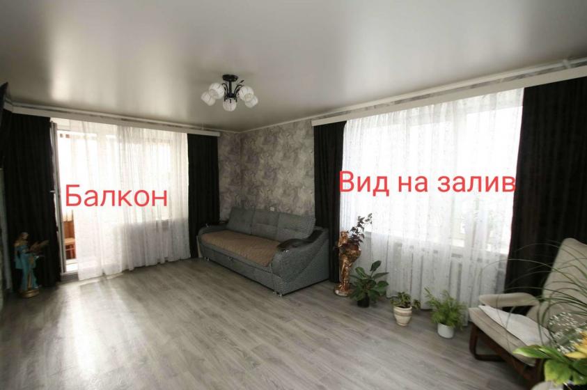 Гостиная квадратной формы с двумя большими окнами балконом и широкими подоконниками. Из окна вид на финский залив