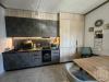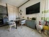 Большая кухня с современным встроенным гарнитуром и всей необходимой техникой, столовая зона и зона отдыха с большим диваном и телевизором.
