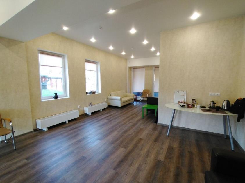 Кабинет,комната для охраны,большой зал с шестью панорамными окнами,два сан узла.