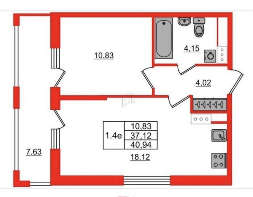 Комната 10.83 кв. м. , кухня 18.12 кв. м, прихожая 4.02 кв. м. , санузел 4,15 кв. м.,