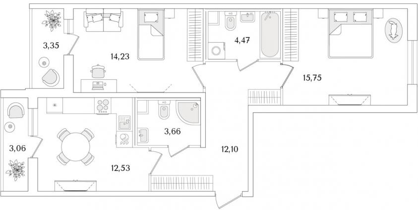 2-комнатная квартира66 кв.м.