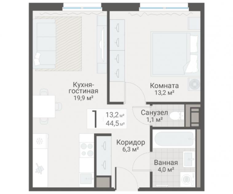 1-комнатная квартира44.5 кв.м.