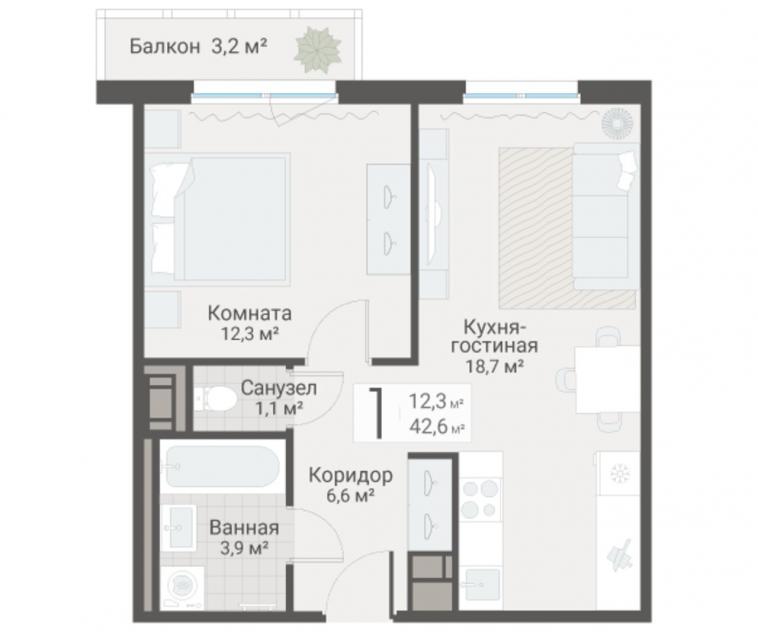 1-комнатная квартира42.6 кв.м.