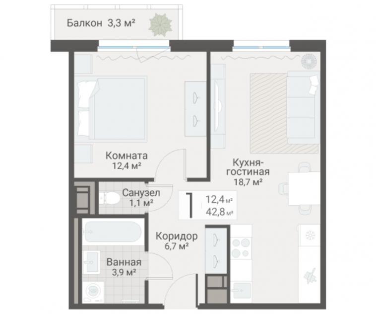 1-комнатная квартира42.8 кв.м.