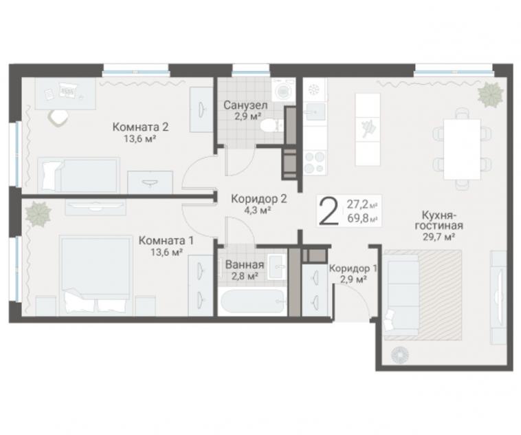 2-комнатная квартира69.8 кв.м.