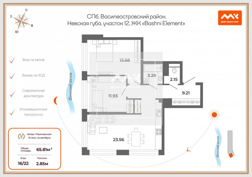 3-Евро квартира 65.81кв.м. с просторной кухней-гостиной 23.5 кв.м. и две спальни 15,68 и 11,93 кв.м. Квартира расположена на 16-м этаже в корпусе CARBON c видом на залив, огни Кронштадта.