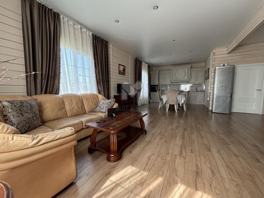 Дом укомплектован мебелью: дорогая кухня из массива, в комнатах установлены деревянные двери. В покраске стен использовалась краска тикурилла.