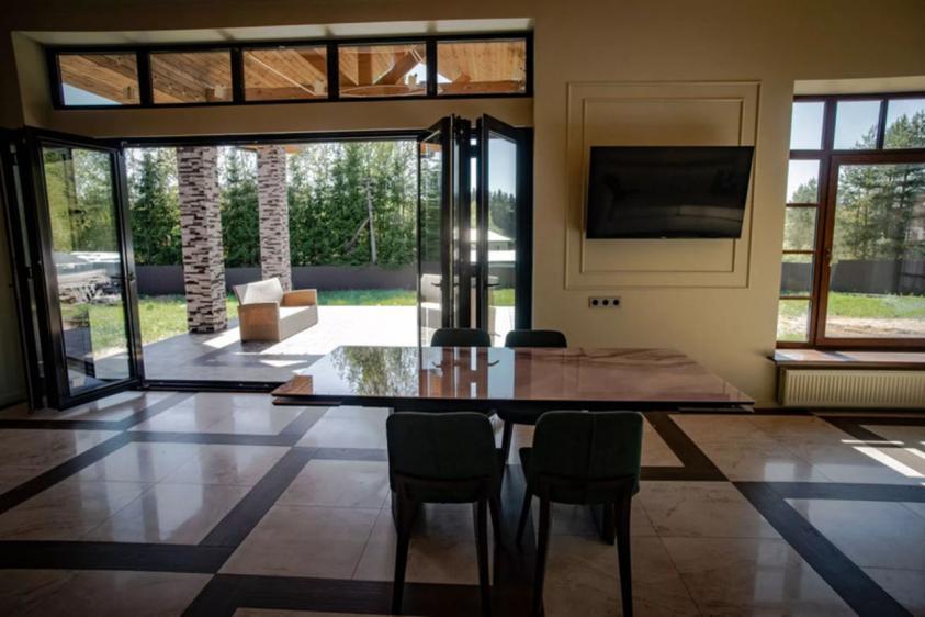 - просторная кухня-гостиная со вторым светом и выходом на террасу через портальную дверь (4,2 м), кухонный гарнитур со встроенной техникой - 5 м по стене плюс островная часть 2х1 м с местом для барных стульев, обеденный стол 2.6 м, мягкая мебель ROOMA design & furniture. Терраса - 36 кв.м. меблирована плетеной мебелью. Три большие комнаты (по 22 м с нишами под встроенные шкафы, кабинет 14 кв.м, большая комната-гардеробная с окном и отдельными встроенными нишами под обувь, комната-холодильник 7 кв.м., три санузла (ванная, душевая, гостевой) с немецкой сантехникой HansGrohe, инсталляциями TECE, мебелью, зеркалами.