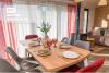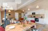 •? ? Просторная кухня-гостиная с камином, обеденным столом и мягким угловым диваном;