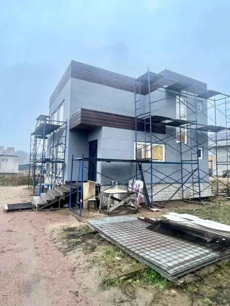 Большая кухня-гостиная с камином на первом этаже, и три спальни на втором этаже. Все коммуникации проведены в дом.