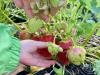 Плодовые кустарники (малина и смородина), плодовые деревья (яблоня и груша), грядки, огороженные заборчиком, клубника, туи.