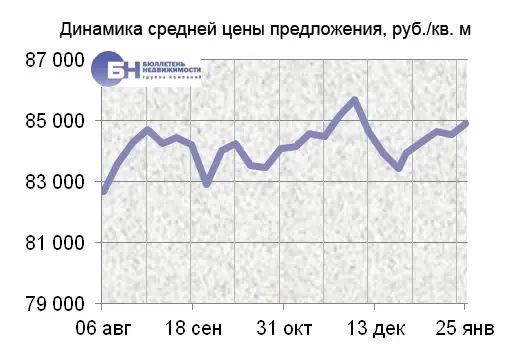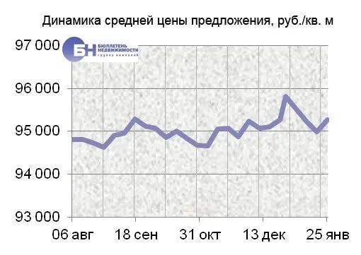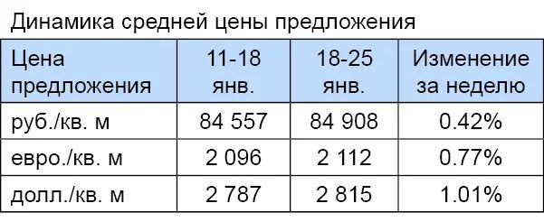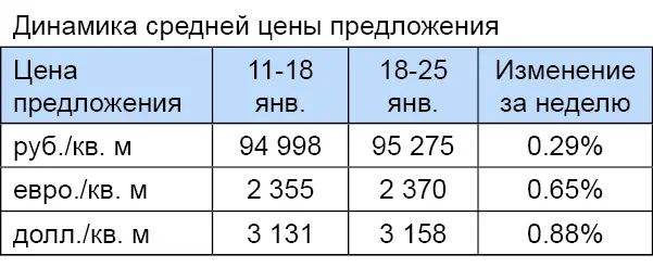 За минувшую неделю изменение средней цены предложения на вторичном рынке квартир в рублевом эквиваленте составило 0,3%, это 276,1 руб. с одного квадратного метра. Показатель средней цены предложения за неделю с 18 января по 25 января 2013 года составил 95,3 тыс. руб. за кв. м. Цена предложения в долларах составила 3,2 тыс. за кв. м, в евро – 2,4 тыс.