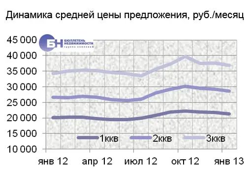 За минувший месяц изменение средней цены предложения на рынке аренды однокомнатных квартир составило минус 1,9%, средняя стоимость в январе 2013 года – 21,3 тыс. руб. в месяц. Двухкомнатные показали минус 2%, средняя цена аренды составила 28,7 тыс. руб. в месяц.