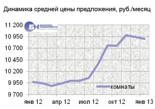 Стоимость аренды трехкомнатных квартир в Петербурге на конец месяца составила 36,9 тыс. руб. в месяц, что на 2% меньше декабря 2012 года. Средняя цена предложения комнат понизилась на 0,3%, стоимость аренды в месяц составила 10,9 тыс. руб.