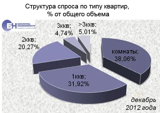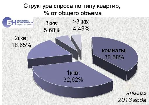 В структуре предложения на рынке аренды типового жилья в январе 2013 года по-прежнему преобладают комнаты и однокомнатные квартиры, занимая соответственно 34,7 и 37,7% рынка. Двухкомнатные составляют 20,1%, доля трехкомнатных не превышает 7%. Многокомнатные (от 4 и более комнат) составляют 0,7% от общего объема типовых квартир, предлагаемых в аренду.