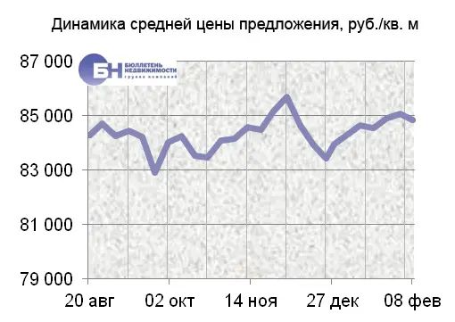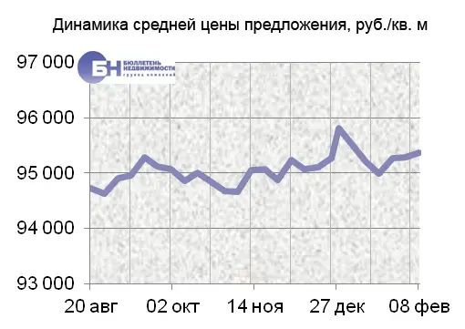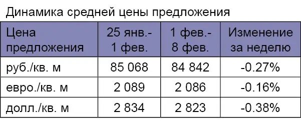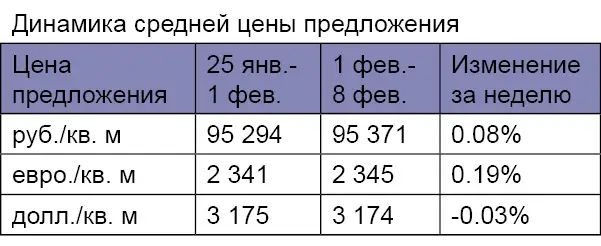 За минувшую неделю изменение средней цены предложения на вторичном рынке квартир в рублевом эквиваленте составило 0,1%, это 77 руб. с одного квадратного метра. Показатель средней цены предложения за неделю с 1 февраля по 8 февраля 2013 года составил 95,4 тыс. руб. за кв. м. Цена предложения в долларах составила 3,2 тыс. за кв. м, в евро – 2,3 тыс.