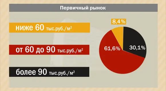 Доля объектов, цена которых меньше 60 тыс. руб. за кв. м, составляет 8,4% от общего объема предложения квартир. Большую долю рынка занимает диапазон цены от 60 до 90 тыс. руб. за кв. м, что составляет 61,6% от объема выставленных на продажу квартир. Доля дорогих объектов, цена которых превышает 90 тыс. руб. за кв. м, в сумме – 30,1% от всего предложения.