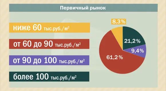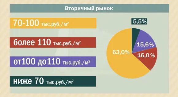 Доля объектов, цена которых меньше 70 тыс. руб. за кв. м, составляет 5,5% от общего объема предложения квартир. Большую долю рынка занимает диапазон цены от 70 до 100 тыс. руб. за кв. м, что составляет 63% от объема выставленных на продажу квартир. Доля дорогих объектов, цена которых превышает 110 тыс. руб. за кв. м, занимает 16% от всего предложения.