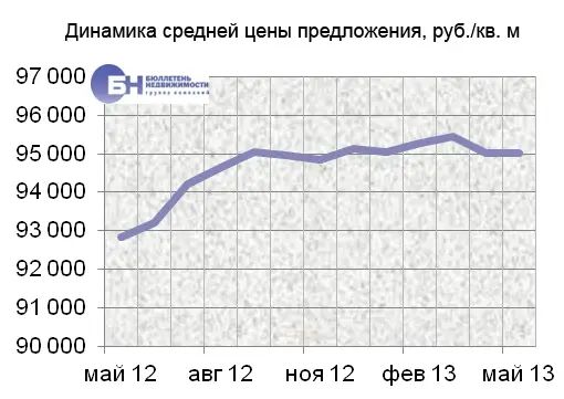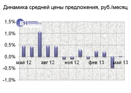 Объем предложения в мае 2013 года составил 21,1 тысячу квартир, выставленных на продажу в течение месяца, что на 8,3% ниже показателя в апреле 2013 года. Максимальный объем предложения за прошедший год зафиксирован в феврале.