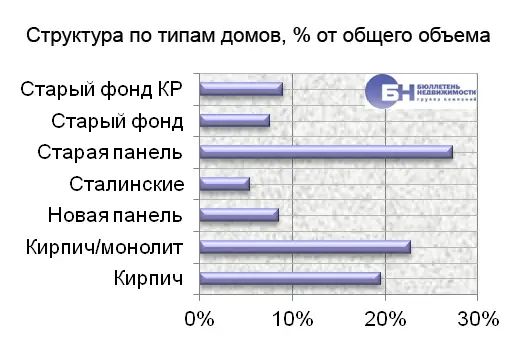 В предложении с разбивкой по типу дома в мае 2013-го, как и в апреле 2013 года, преобладают кирпичные и кирпично-монолитные дома, в сумме их доля на конец мая 2013 года составляет 42,3%. Также наибольший объем в структуре предложения занимают панельные дома старой постройки – 27,3% от всего рынка. Меньший процент приходится на квартиры в сталинских домах.