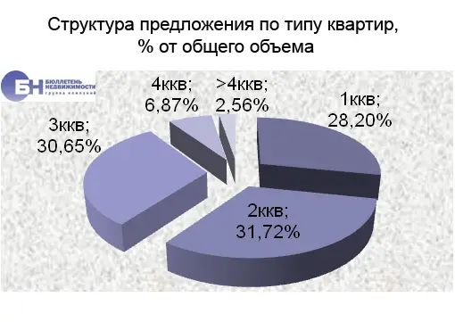 Доля объектов, цена которых меньше 70 тыс. руб. за кв. м, составляет в мае 2013 года 5,5% от общего объема предложения квартир. Большую долю рынка занимает диапазон цены от 70 до 110 тыс. руб. за кв. м, это 78,8% от объема выставленных на продажу квартир. Доля дорогих объектов, цена которых превышает 110 тыс. руб. за кв. м, составляет 15,8% от всего предложения.
