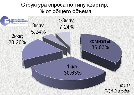 В структуре предложения на рынке аренды типового жилья в мае 2013 года по-прежнему преобладают комнаты и однокомнатные квартиры, занимая соответственно 31,5 и 43,5% рынка. Двухкомнатные составляют 18,7%, доля трехкомнатных не превышает 5,8%. Многокомнатные (от четырех и более комнат) составляют 0,6% от общего объема типовых квартир, предлагаемых в аренду.
