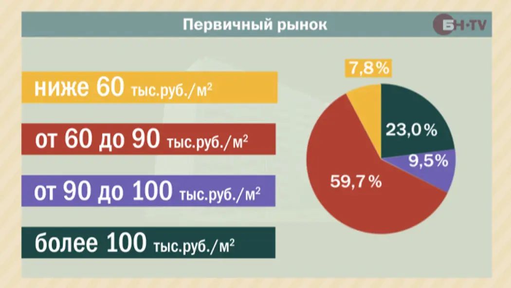 Доля объектов, цена которых меньше 60 тыс. руб. за кв. м, составляет 7,8% от общего объема предложения квартир. Большую долю рынка занимает диапазон цены от 60 до 90 тыс. руб. за кв. м, что составляет 59,7% от объема выставленных на продажу квартир. Диапазон цены квадратного метра от 90 до 100 тыс. руб. занимает 9,5%. Доля дорогих объектов, цена которых превышает 100 тыс. руб. за кв. м, в сумме – 23% от всего предложения.